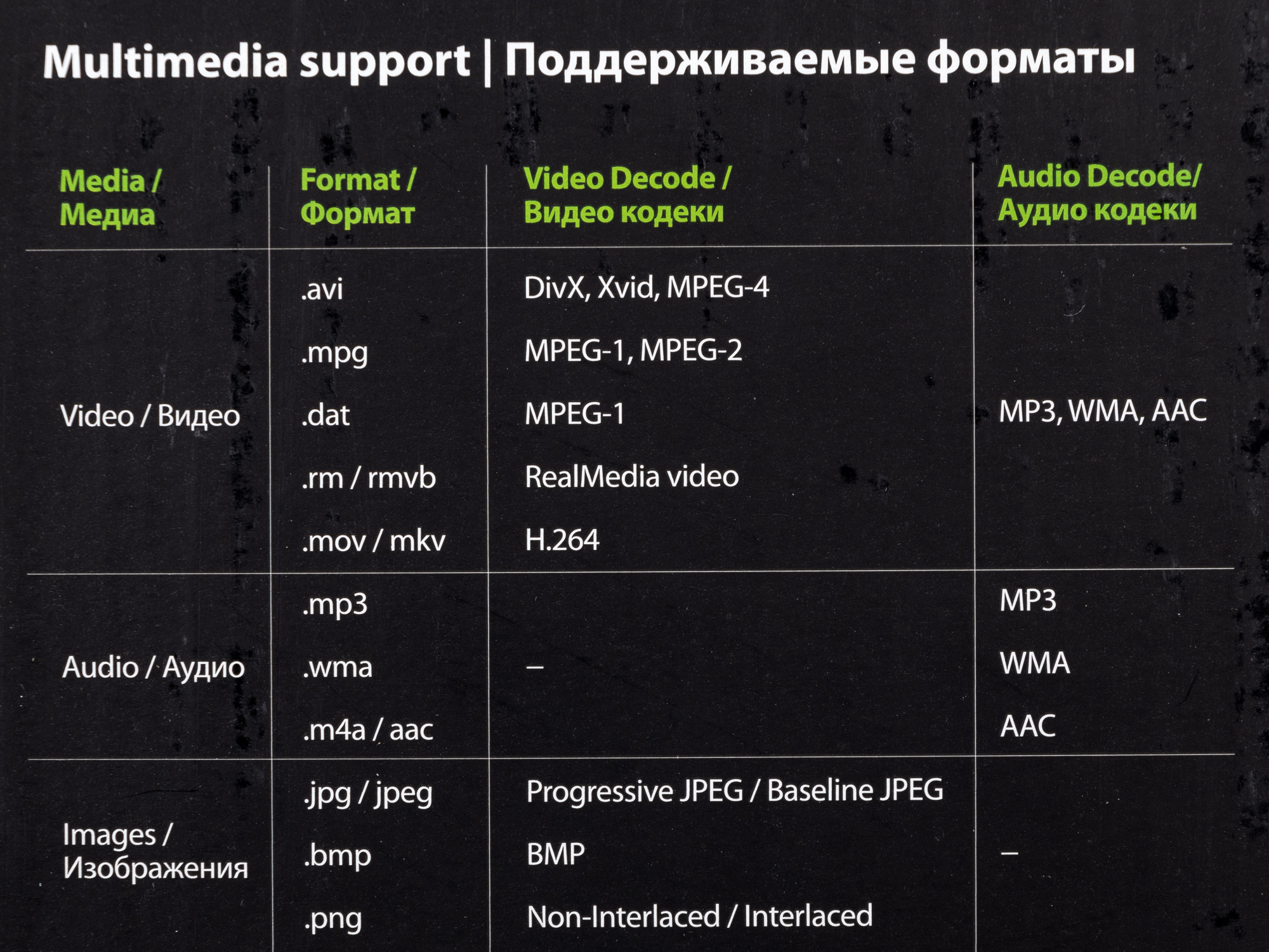 Поддержка видео форматов/кодеков: DIVX, XVID, MOV, MKV, RMVB