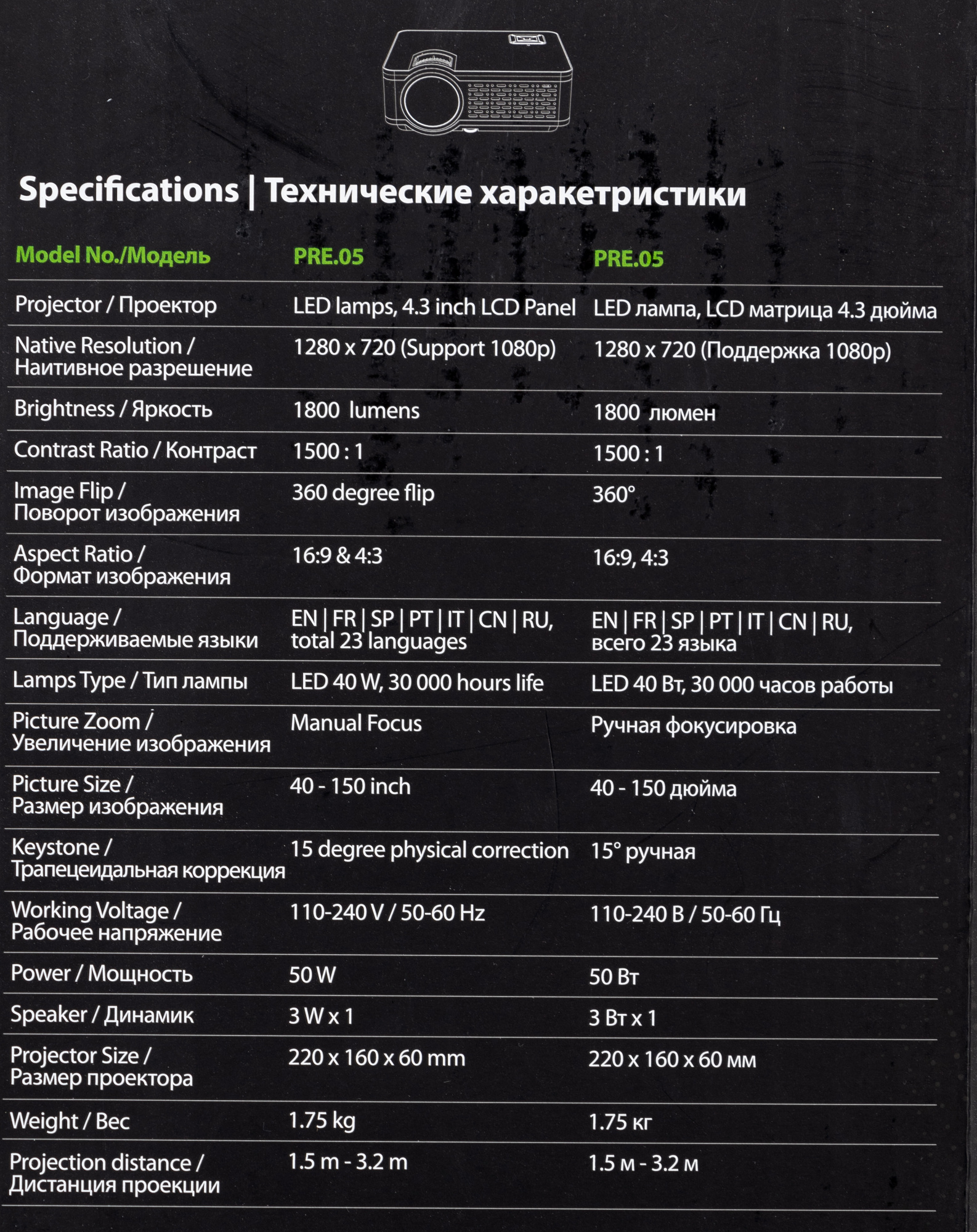 Комплектация: кабель HDMI 1.5м, 3,5 мм кабель AV, кабель питания, пульт ДУ, салфетка из микрофибры, руководство пользователя