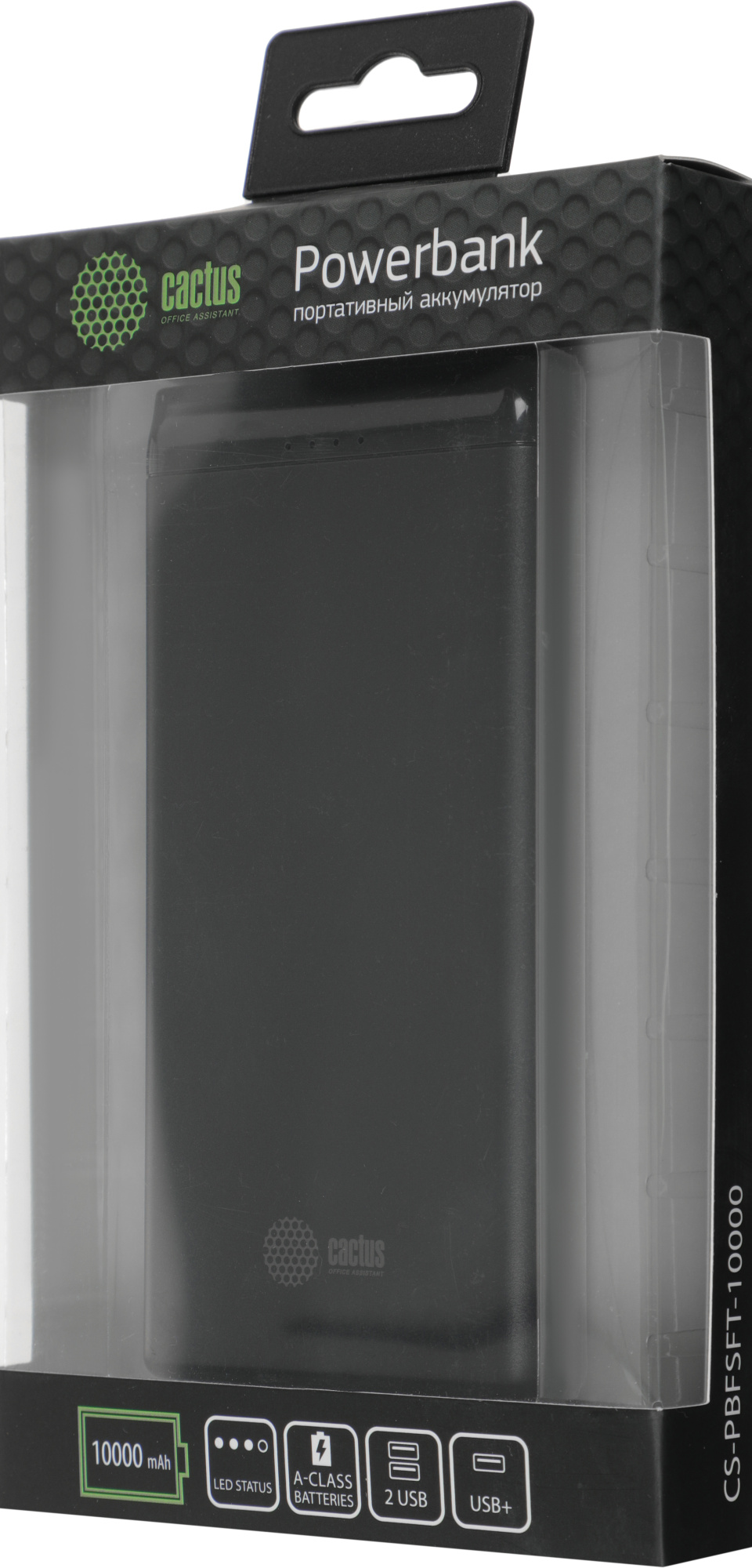 Текстовое описание: Портативный аккумулятор Cactus CS-PBFSFT-10000 отличается современным дизайном, корпус выполнен из пластика, благодаря чему устройство имеет малый вес. В его основе используется высококачественный Li-pol элемент, ёмкостью 10000 мАч. Такая емкость позволяет несколько раз восполнить заряд смартфона, смарт-часов, МР3-плеера или других устройств. Все разъёмы расположены на верхней грани корпуса аккумулятора. Модель оснащена двумя USB-разъёмами с max током 2.1А. Для восполнения заряда самого аккумулятора в комплекте поставляется кабель USB Type-C или micro-USB для подключения к зарядному блоку через соответствующий разъём. LED-индикатор на корпусе показывает состояние заряда. Устройство обладает электронной системой защиты от перезарядки и коротких замыканий.