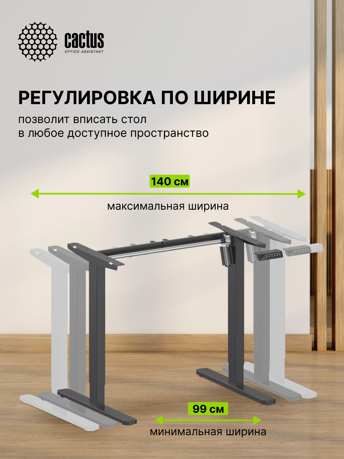 Идеальный выход для тех, кто ищет нестандартные решения и ценит комфорт. Подстолье для работы сидя или стоя, с электроприводом. Регулировка высоты в диапазоне от 72 до 120 см. Удобная панель управления с функцией памяти на 2 положения. Регулируемая ширина подстолья, от 99 до 140 см, подходит для столешниц различных форм и размеров. Рекомендуемые размеры столешницы для использования с подстольями данной серии: 110-160см по ширине и 60-80см по глубине. Регулируемая высота обеспечивает максимальный комфорт и позволяет адаптировать рабочее место под самые различные потребности. Выравнивающие ножки стола адаптируются к большинству неровных полов и поверхностей. Возможность раздельного приобретения подстолья и столешницы дает неограниченное количество вариаций, вы можете создать свой собственный стиль рабочего стола, исходя из нужных именно вам размера, формы, материала и цвета.