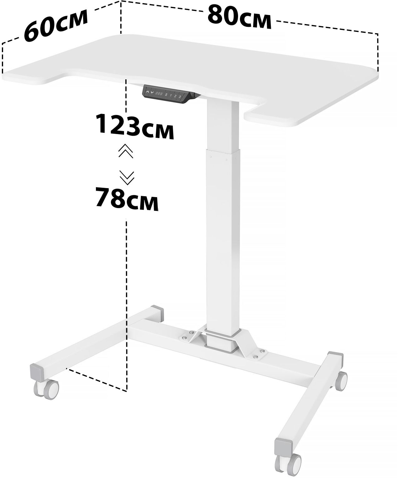 Тип: Стол для ноутбука Тип стола: приставной Способ установки: приставной Тип подъемного механизма: электропривод Форма столешницы: прямоугольная Материал основания: металл Цвет основания: белый Максимальная нагрузка: 40 кг Материал столешницы: МДФ Тип питания: от сети 220 В Размеры: 80x123x60см Цвет: белый Цвет металлического каркаса: белый Вес изделия в упаковке: 20.1 кг Габариты упаковки (ед) ДхШхВ: 0.67x0.87x0.15 м