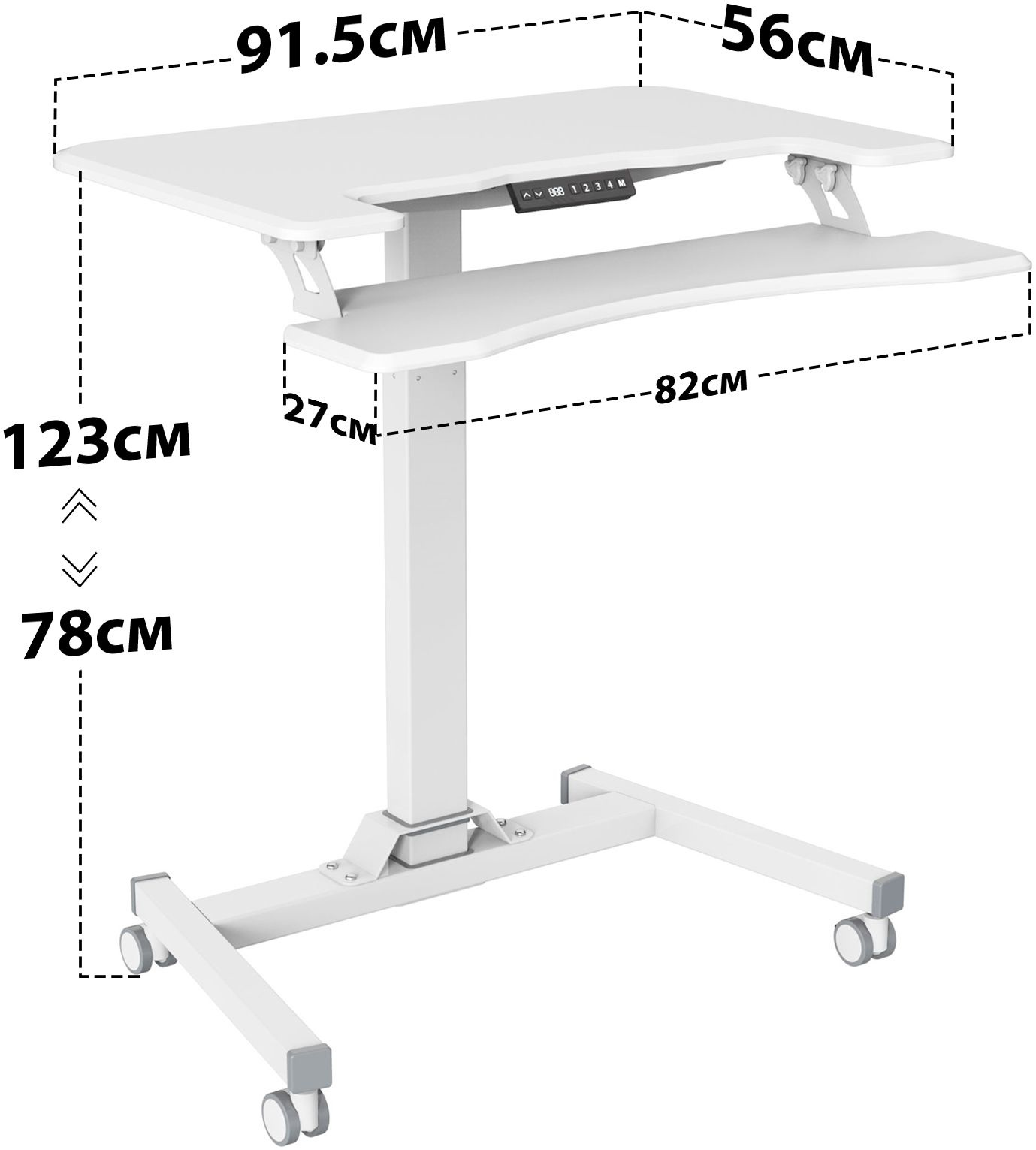 Тип: Стол для ноутбука Тип стола: приставной Способ установки: приставной Тип подъемного механизма: электропривод Форма столешницы: прямоугольная Материал основания: металл Цвет основания: белый Максимальная нагрузка: 40 кг Материал столешницы: МДФ Тип питания: от сети 220 В Размеры: 91.5x123x56см Цвет: белый Цвет металлического каркаса: белый Вес изделия в упаковке: 25.05 кг Габариты упаковки (ед) ДхШхВ: 0.885x0.98x0.195 м