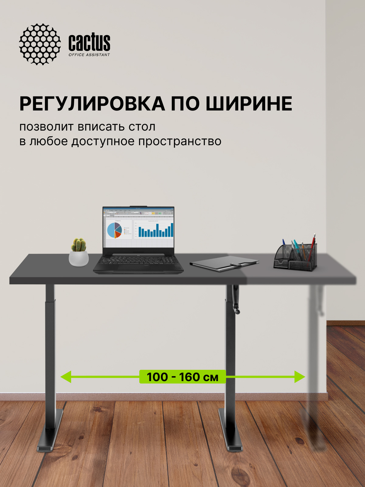 Бюджетное решение для тех, кто ценит комфорт. Подстолье для работы сидя или стоя, с ручной регулировкой высоты в диапазоне от 70 до 118 см. Складная ручка подъемного механизма не создает помех. Регулируемая ширина подстолья, от 86 до 133 см, подходит для столешниц различных форм и размеров. Рекомендуемые размеры столешницы для использования с подстольями данной серии: 100-160см по ширине и 60-75см по глубине. Регулируемая высота обеспечивает максимальный комфорт и позволяет адаптировать рабочее место под самые различные потребности. Выравнивающие ножки стола адаптируются к большинству неровных полов и поверхностей. Возможность раздельного приобретения подстолья и столешницы дает неограниченное количество вариаций, вы можете создать свой собственный стиль рабочего стола, исходя из нужных именно вам размера, формы, материала и цвета