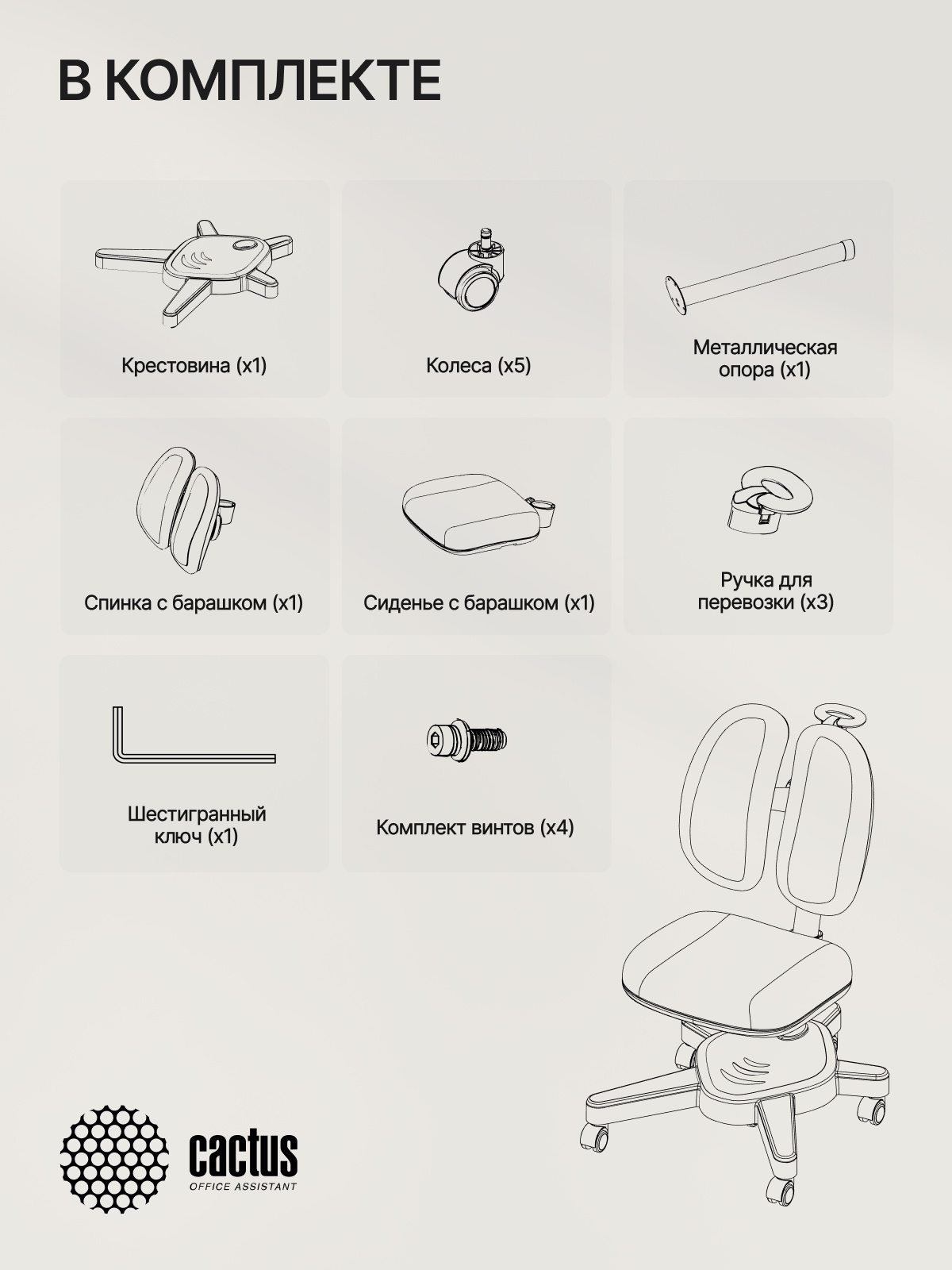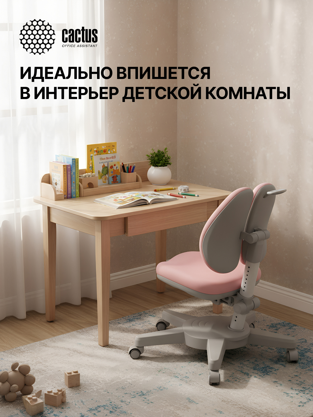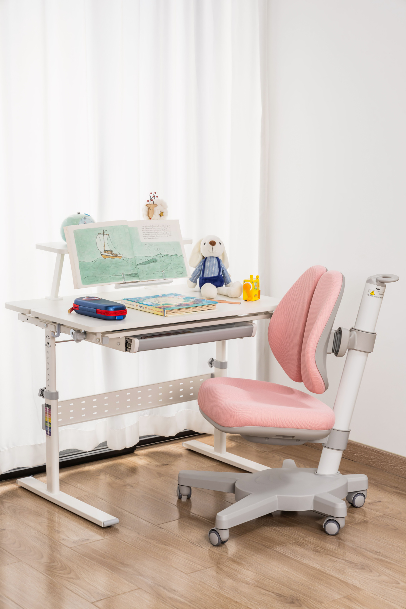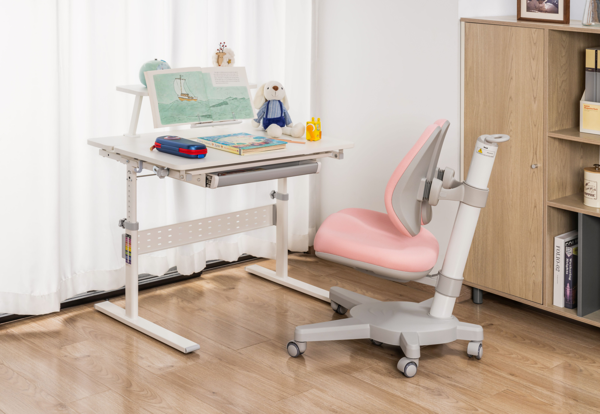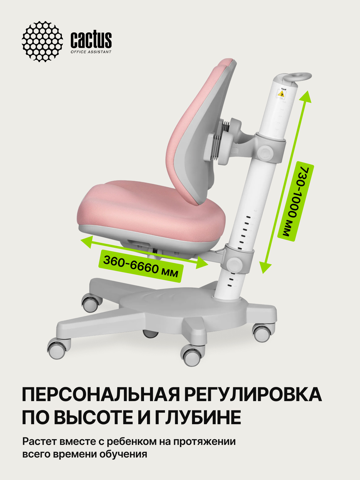 Простая регулировка высоты сиденья и высоты спинки. Кресло обито прочной и безопасной в эксплуатации тканью спокойных пастельных оттенков. В летние месяцы не будет жарко, а в холодное время года сидеть на кресле будет тепло и комфортно. На опоре кресла имеется специальная шкала для выставления высоты стола и кресла в соответствии с ростом ребенка.