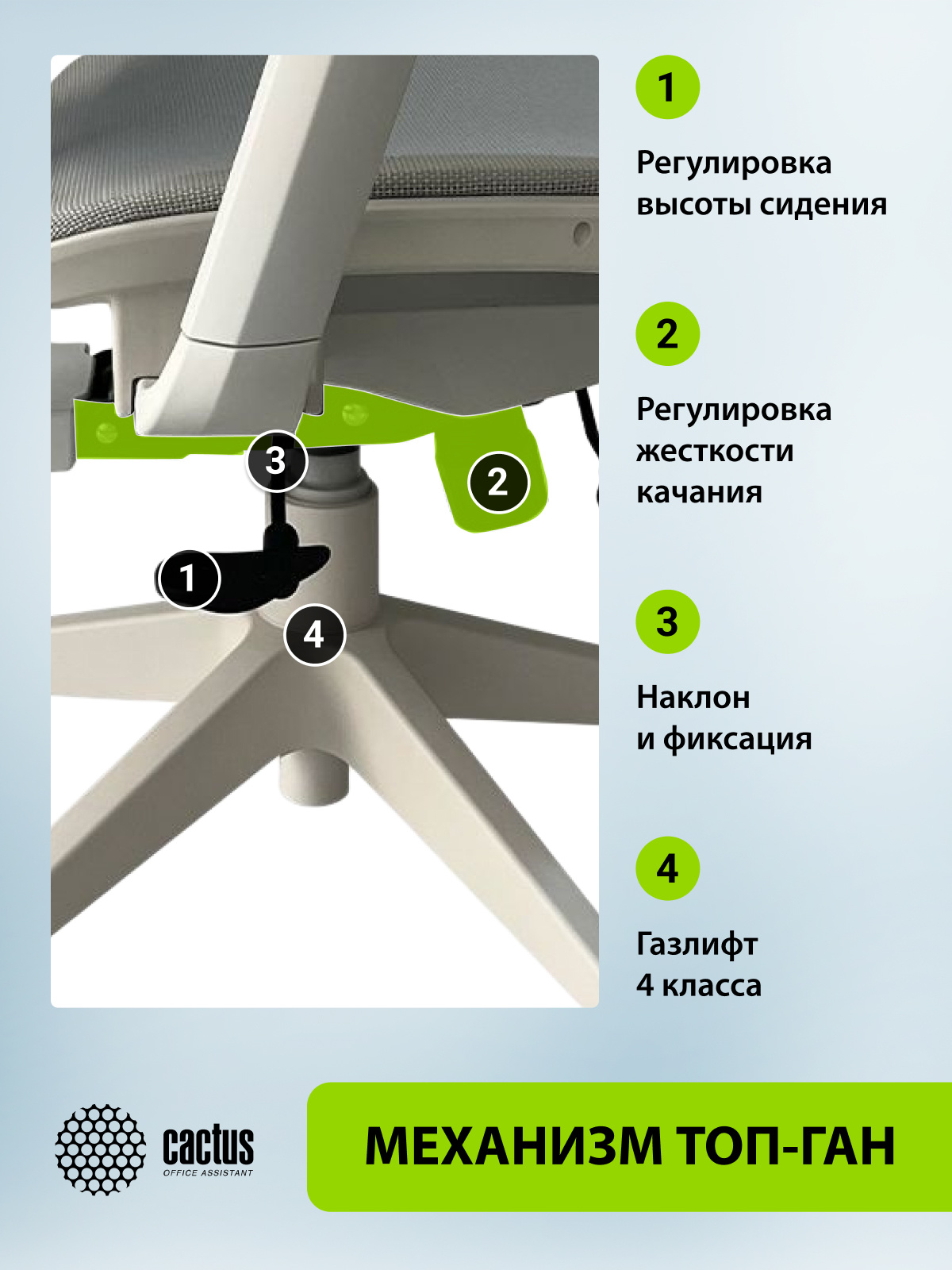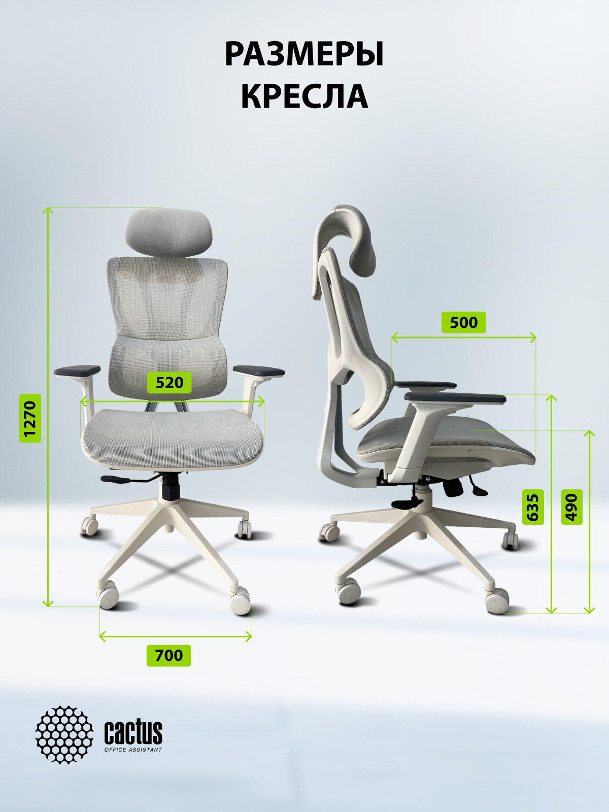 Сетчатое офисное кресло Cactus CS-CHR-MC02GY обладает изящным профилем и приглушенным решением цветовой гаммы. Такие модели изготавливаются под естественные изгибы позвоночника, что обеспечивает поддержку всей спине.