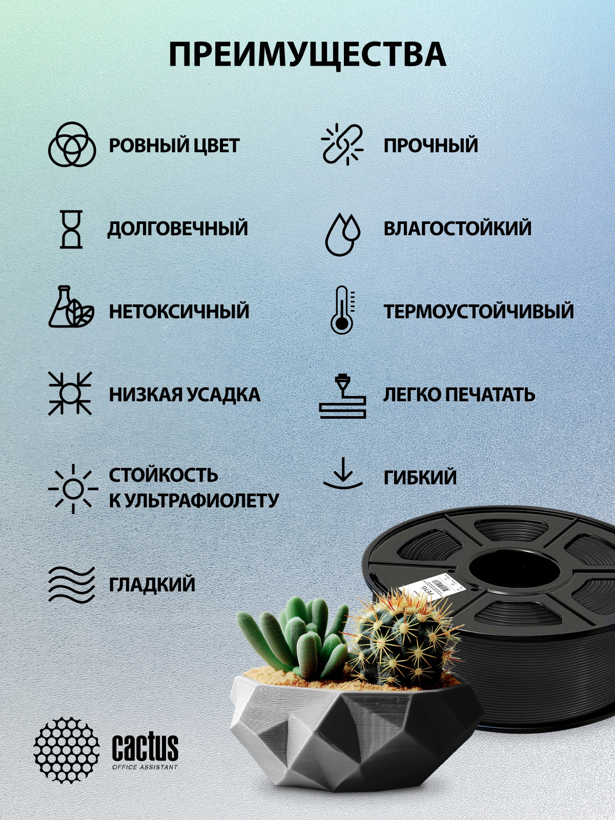 Материал пластика: PETG Диаметр пластика: 1.75 мм Длина пластика: 316 м Цвет 1: черный Вес пластика: 1 кг