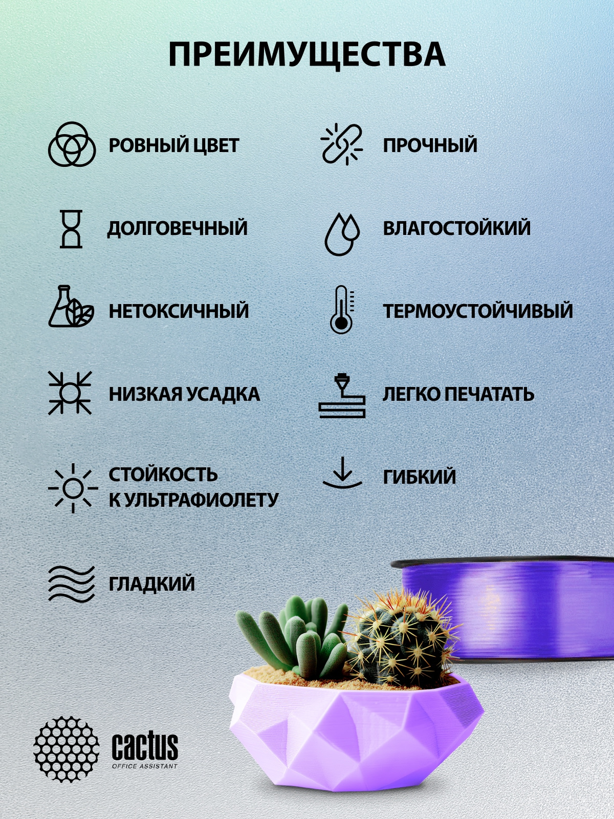 Материал пластика: PETG Диаметр пластика: 1.75 мм Длина пластика: 316 м Цвет 1: фиолетовый прозрачный Вес пластика: 1 кг