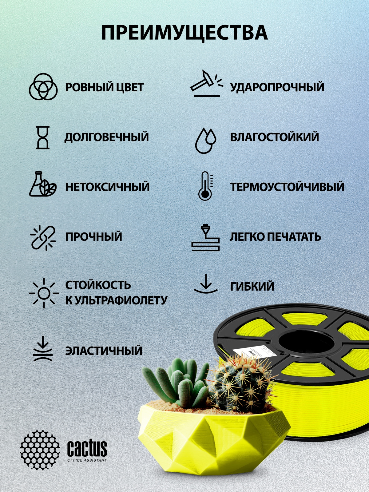 Материал пластика: TPU Диаметр пластика: 1.75 мм Длина пластика: 336 м Цвет 1: желтый Вес пластика: 0.8 кг