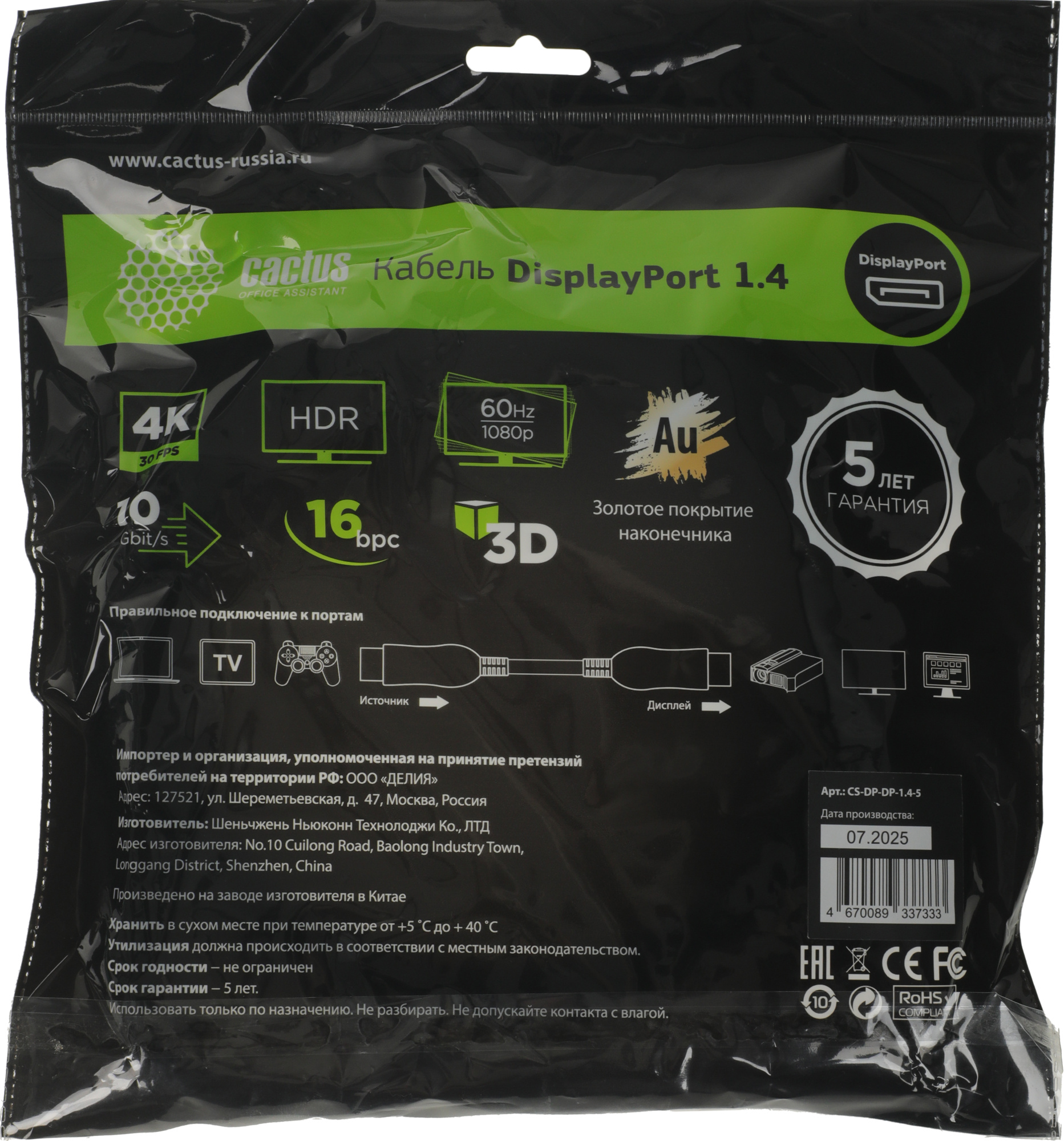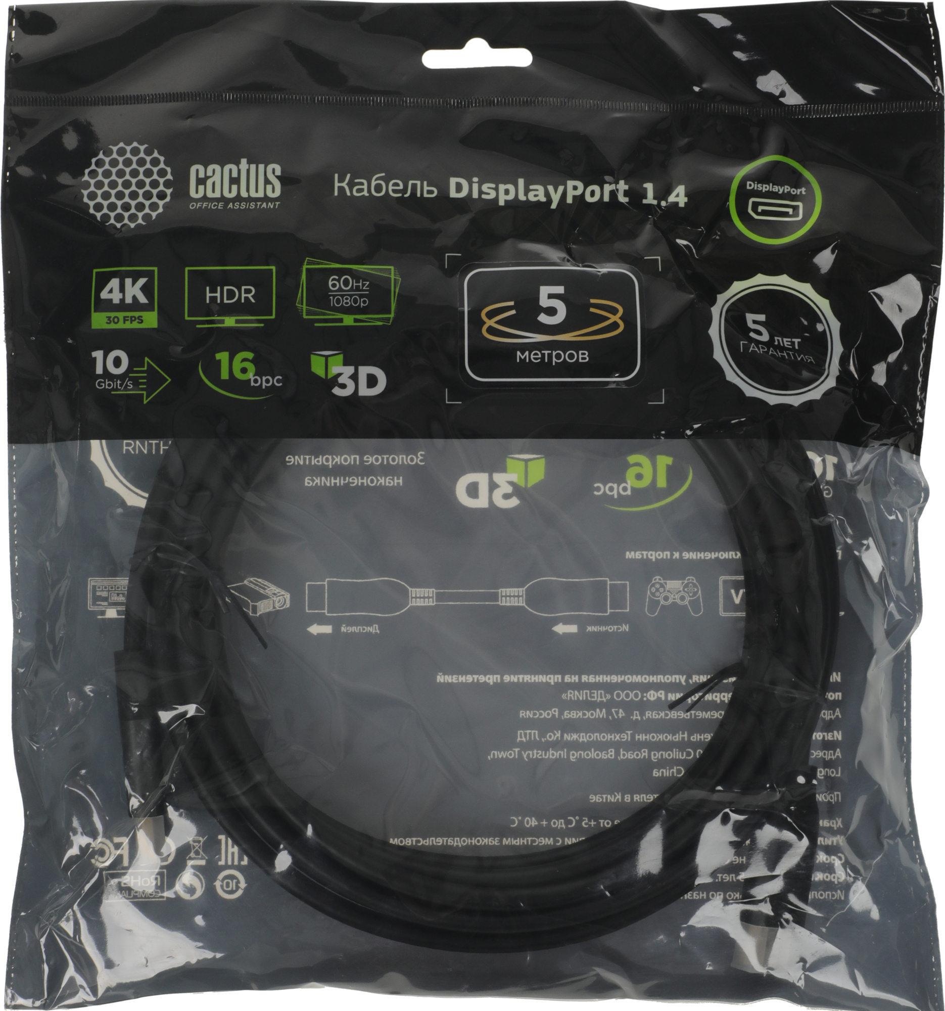 Модель: CS-DP-DP-1.4-5 Разъем №1: DisplayPort (m) Разъем №2: DisplayPort (m) Позолоченные контакты: ДА Цвет: черный