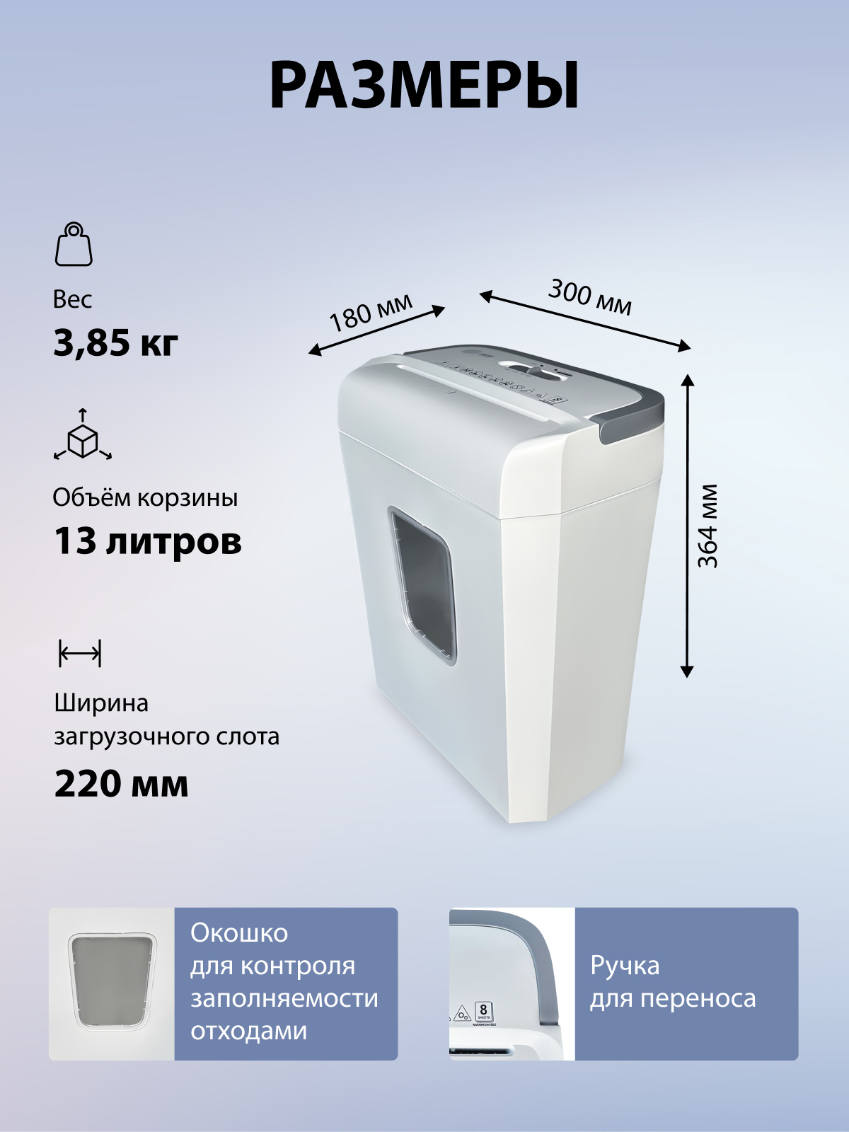 Уровень секретности DIN 66399 для бумаги: P-4 Емкость корзины: 13 л Одновременно листов, до: 8 Тип резки: фрагменты Размер фрагментов: 5x18 мм Средняя скорость: 1.5 м/мин Макс. время работы: 4 мин Необходимое время перерыва: 40 мин Автореверс: ДА Переработка скрепок: ДА Переработка степплерных скоб: ДА Переработка кредитных карт: ДА Уровень шума: 70 дБ Особенности: ручка для переноса Ширина загрузочного слота: 220 мм Габариты упаковки (ед) ДхШхВ: 0.305x0.18x0.31 м