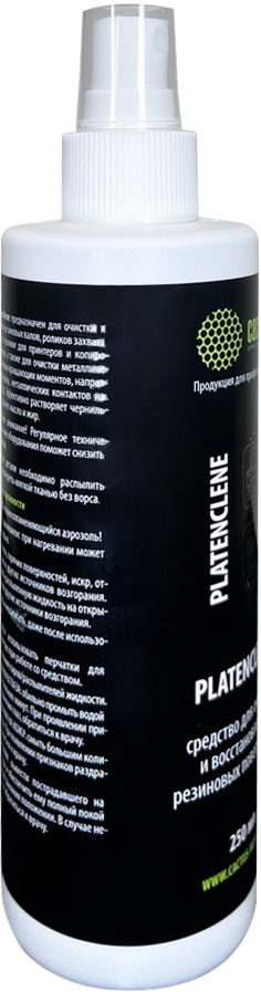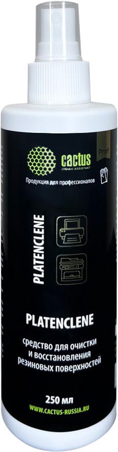 Cactus Platenclene разработан для очистки и восстановления резиновых поверхностей, валов проявки для принтеров и копировальной техники, роликов захвата бумаги, а также для очистки металлических и пластиковых вращающих моментов, направляющих картриджа, металлических контактов на картридже и пр. Очиститель эффективно растворяет тонерные и чернильные пятна, удаляет масло и жир.
